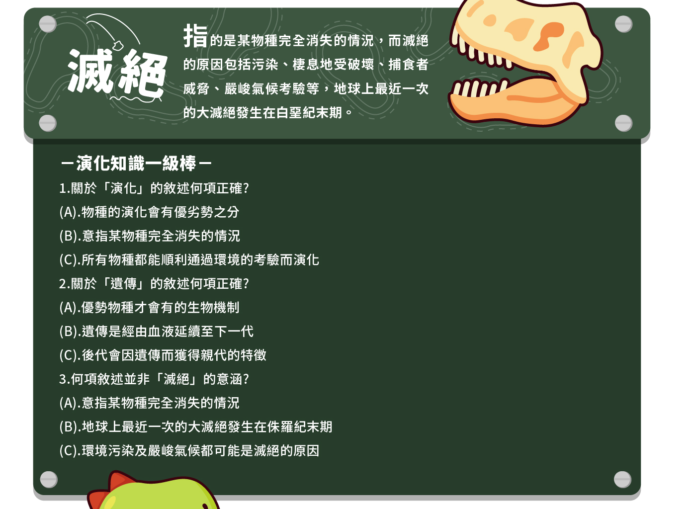 恐龍知識小測驗解答: 1.(C) 2.(C) 3.(C) 4.(A)