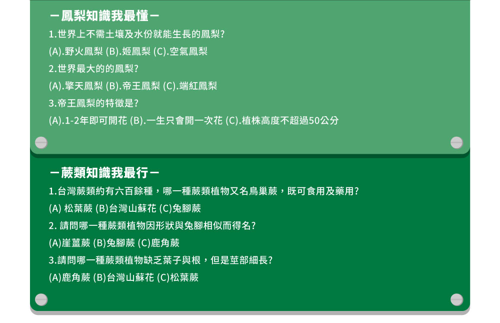 蕨類知識小測驗解答: 1.(B) 2.(B) 3.(C)