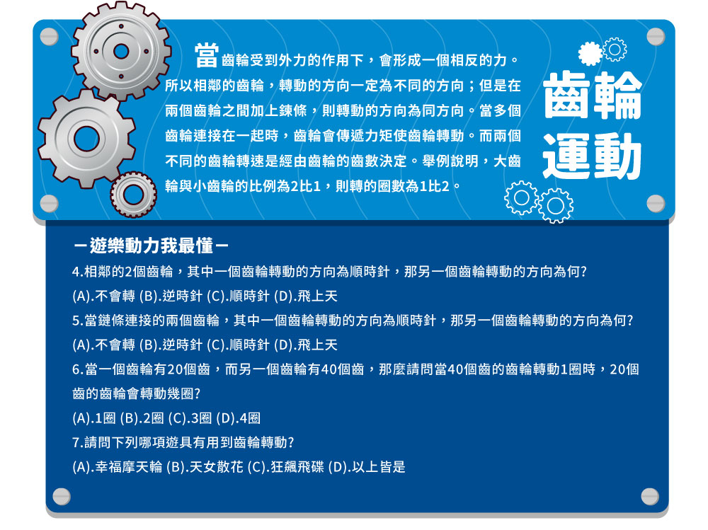 齒輪運動小測驗解答: 4.(B) 5.(C) 6.(B) 7.(D)