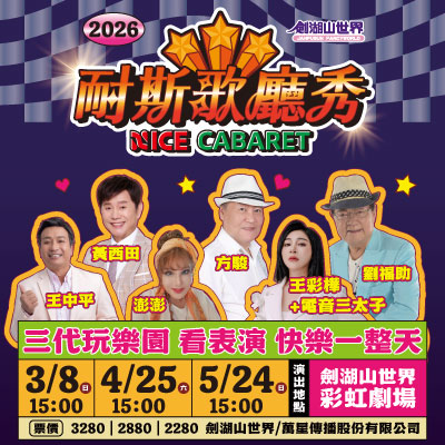 News & Activity 最新消息 優惠速報園區快訊最新活動 2026-01-01優惠速報 樂園優惠一覽,速速看過來! 來劍湖山一票暢玩嗨翻天!各種期間限定優惠通通集結於此! 2026-01-24優惠速報 劍湖山世界2026【耐斯歌廳秀】 一家三代玩樂園 看表演 快樂一整天 一家三代玩樂園看表演快樂一整天!黃西田、王彩樺與電音三太子、王中平、澎澎、方駿、劉福助、梁佑南、劉美玲、賈斯汀、蔡亞露、許仁杰、朱海君、超跑杰克,主持人胡鴻達、梅東生,都在耐斯歌廳秀! 2026-01-21優惠速報 遊劍湖山世界歡樂+1 憑劍湖山世界票根再暢遊佐登妮絲城堡 憑劍湖山世界現場售票票根,2026.03.01(日)前可再暢遊佐登妮絲城堡一次 2022-08-01園區快訊 小火車【劍湖山古坑號】開駛啦! 玩累了!?腳痠了!?搭乘小火車【劍湖山古坑號】帶你快速抵達目的地! 2025-05-21園區快訊 《賀》劍湖山世界酷咖啡 獲頒雲林良品30大伴手禮 最佳人氣獎 《賀》劍湖山世界酷咖啡獲頒雲林良品30大伴手禮最佳人氣獎 2023-10-29園區快訊 體驗咖啡烘豆與手沖咖啡的樂趣☕️ 限量體驗價550元/人 KUCOFFEE藉由台灣在地手作咖啡豆烘焙與手沖咖啡體驗,與您一起分享咖啡的快樂、幸福時光! 2026-01-08園區快訊 2025年11-12月|填問卷抽好禮得獎名單 得獎名單出爐啦!恭喜所有獲獎者,請於回覆時間截止前,至劍湖山世界官方粉絲專頁私訊小編或致電05-582-5789聯繫領獎相關事宜,謝謝您。 2026-01-28最新活動 Cheer UP !! 元氣應援團|啦啦隊女孩見面會|精彩活動一覽|劍湖山世界 CheerUP!!元氣應援團熱血登場!人氣啦啦隊女孩見面會週週活力應援,還有超多精彩活動!這個春天就來劍湖山世界,為你補充滿滿元氣! 2021-05-31最新活動 KU COFFEE|咖啡茶葉博覽館 生活玩味,酷時尚!就讓KUCOFFEE的香醇咖啡與甜點,陪你共度浪漫時光吧! 2023-01-14最新活動 玩樂園也能長知識,一起智遊劍湖山! 樂園就是校園,玩樂園也能長知識,多樣課題任你選,一起智遊劍湖山!