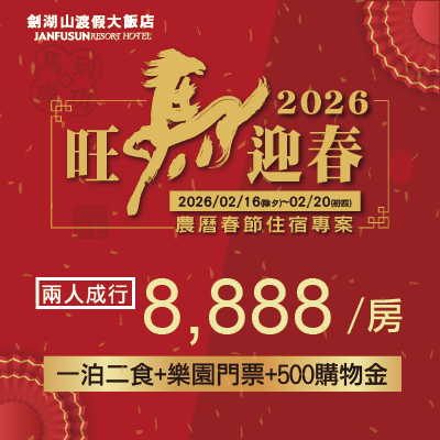 2025-08-30住宿優惠 【2026】旺馬迎春 農曆春節住宿專案 2024-10-30餐飲優惠 春節餐飲營業時間 X 春節限定菜單 2025-12-19住宿優惠 【2026】春遊童樂住宿專案 【2026】春遊童樂住宿專案 入住日期:2026/01/01(四)~2026/04/30(四) 2025-10-25婚宴專案 【2026幸福花嫁情定劍湖山 婚宴專案】 讓劍湖山渡假大飯店,為您留下經典璀璨的幸福婚宴~ 2025-10-08活動與公告 安心宣言 安心美味,從嚴格把關開始 2025-10-04餐飲優惠 尾牙春酒 x 優惠專案 2025-08-29住宿優惠 【2026】連假住宿優惠 |一泊一食 只要$4200 2026連假一泊一食專案 2025-08-27活動與公告 緊急公告 飯店粉絲專頁遭遇不明人士入侵,導致管理權限被移除,目前官方團隊已暫時無法透過此專頁進行正常的貼文與訊息回覆。 2024-11-22活動與公告 隱私權暨個資保護聲明 2025-12-17住宿優惠 【2026】超寵粉住宿專案 超寵粉住宿專案 銷售日期:即日起~1/29止 2025-10-25婚宴專案 【2026年文定專案】珍愛一生 情定劍湖山 締結良緣幸福從這裡開始吧! 2025-04-01餐飲優惠 蔚藍西餐廳x暖冬藥膳美食季 2025-06-12住宿優惠 【2025】普發一萬 劍湖山送一萬✦* 【2025】普發一萬劍湖山送一萬✦* 專案日期:即日起至~2026/04/30止 2023-12-30餐飲優惠 #2026限定 蔚藍西餐廳x鄉親優惠 2026-01-01餐飲優惠 #2026限定 壽星用餐優惠 2023-12-30餐飲優惠 #2026限定 蔚藍西餐廳x銀髮優惠 2026-01-01活動與公告 劍湖山渡假大飯店 2026年【客房】平假日定義表 2026年劍湖山渡假大飯店客房平假日定義 2025-12-13住宿優惠 【2026當月壽星】住宿專案 生日是一年一度的特別日子,來場獨特的住宿體驗! 專案日期:2026年1月2日至12月29日 2025-01-01活動與公告 劍湖山渡假大飯店 2026年【餐飲】平假日定義表 2026年劍湖山渡假大飯店餐飲平假日定義 2024-04-04活動與公告 住宿不提供一次性備品 公告 因應政府環保政策, 飯店自2024年7月1日起,將不提供一次性客房備品。 2024-10-01餐飲優惠 限定伴手禮幸福手作餅乾X中庭酒吧 劍湖山渡假大飯店限定幸福手作餅乾,讚不絕口的好滋味! 2025-12-10住宿優惠 【2026】高年級旅遊 兩人成行NT$2888/房起 #2026限定 專案日期:自2026年1月2日至2026年12月29日 2025-12-05住宿優惠 【2026年度住宿專案】一泊一食 X 兩人成行$4300元起 專案日期:2026年1月2日至12月30日 2025-10-15婚宴專案 【2026年戶外證婚儀式專案】 2023-11-21餐飲優惠 精選伴手禮 劍湖山渡假大飯店限定好禮!!! 2023-01-08餐飲優惠 劍湖山渡假大飯店x經典『啡黃酥』禮盒 『啡黃酥』榮獲雲林良品伴手禮金讚獎!