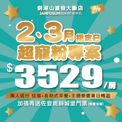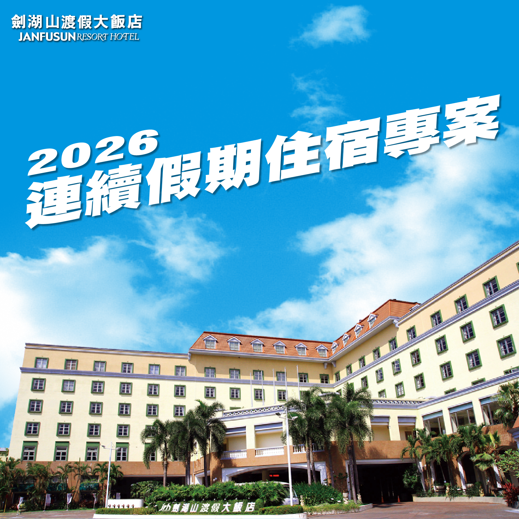 2025-08-30住宿優惠 【2026】旺馬迎春 農曆春節住宿專案 2024-10-30餐飲優惠 春節餐飲營業時間 X 春節限定菜單 2026-01-11餐飲優惠 禪園中餐 X 海陸豐饌圍爐宴 2026-01-11餐飲優惠 年菜外帶 x 禪園中餐廳 2025-12-19住宿優惠 【2026】春遊童樂住宿專案 【2026】春遊童樂住宿專案 入住日期:2026/01/01(四)~2026/04/30(四) 2025-10-25婚宴專案 【2026幸福花嫁情定劍湖山 婚宴專案】 讓劍湖山渡假大飯店,為您留下經典璀璨的幸福婚宴~ 2025-10-04餐飲優惠 尾牙春酒 x 優惠專案 2025-08-29住宿優惠 【2026】連假住宿優惠 |一泊一食 $4200|二泊二食$7000 2026連假一泊一食專案 2025-08-27活動與公告 緊急公告 飯店粉絲專頁遭遇不明人士入侵,導致管理權限被移除,目前官方團隊已暫時無法透過此專頁進行正常的貼文與訊息回覆。 2024-11-22活動與公告 隱私權暨個資保護聲明 2025-12-17住宿優惠 【2026】一月份指定日「超寵粉住宿專案」 超寵粉住宿專案 銷售日期:即日起~1/29止 2025-10-25婚宴專案 【2026年文定專案】珍愛一生 情定劍湖山 締結良緣幸福從這裡開始吧! 2025-04-01餐飲優惠 蔚藍西餐廳x暖冬藥膳美食季 2026-01-16住宿優惠 【2026】2-3月『超寵粉UP!!』住宿專案~吃.住.玩.樂全包!!! 耐斯企業、愛之味關係企業專區 2025-06-12住宿優惠 【2025】普發一萬 劍湖山送一萬✦* 【2025】普發一萬劍湖山送一萬✦* 專案日期:即日起至~2026/04/30止 2023-12-30餐飲優惠 #2026限定 蔚藍西餐廳x鄉親優惠 2026-01-01餐飲優惠 #2026限定 壽星用餐優惠 2023-12-30餐飲優惠 #2026限定 蔚藍西餐廳x銀髮優惠 2026-01-01活動與公告 劍湖山渡假大飯店 2026年【客房】平假日定義表 2026年劍湖山渡假大飯店客房平假日定義 2025-12-13住宿優惠 【2026當月壽星】住宿專案 生日是一年一度的特別日子,來場獨特的住宿體驗! 專案日期:2026年1月2日至12月29日 2025-10-08活動與公告 安心宣言 安心美味,從嚴格把關開始 2025-01-01活動與公告 劍湖山渡假大飯店 2026年【餐飲】平假日定義表 2026年劍湖山渡假大飯店餐飲平假日定義 2026-01-16住宿優惠 【2025】酷奇親子房 兩人成行一泊3食再招待1位12歲以下兒童 兩人成行一泊3食,每房再招待1位12歲以下兒童 2026-01-16住宿優惠 【2026】企業敬軍 ★ 國軍專屬住宿優惠 一泊一食最低每人$1800起 國軍專屬住宿優惠 2023-11-21餐飲優惠 精選伴手禮 劍湖山渡假大飯店限定好禮!!! 2023-01-08餐飲優惠 劍湖山渡假大飯店x經典『啡黃酥』禮盒 『啡黃酥』榮獲雲林良品伴手禮金讚獎! 2024-04-04活動與公告 住宿不提供一次性備品 公告 因應政府環保政策, 飯店自2024年7月1日起,將不提供一次性客房備品。 2024-10-01餐飲優惠 限定伴手禮幸福手作餅乾X中庭酒吧 劍湖山渡假大飯店限定幸福手作餅乾,讚不絕口的好滋味! 2025-12-10住宿優惠 【2026】高年級旅遊 兩人成行NT$2888/房起 #2026限定 專案日期:自2026年1月2日至2026年12月29日 2025-12-05住宿優惠 【2026年度住宿專案】一泊一食 X 兩人成行$4300元起 專案日期:2026年1月2日至12月30日 2025-10-15婚宴專案 【2026年戶外證婚儀式專案】 2025-09-01餐飲優惠 西餐酥皮濃湯加購享優惠