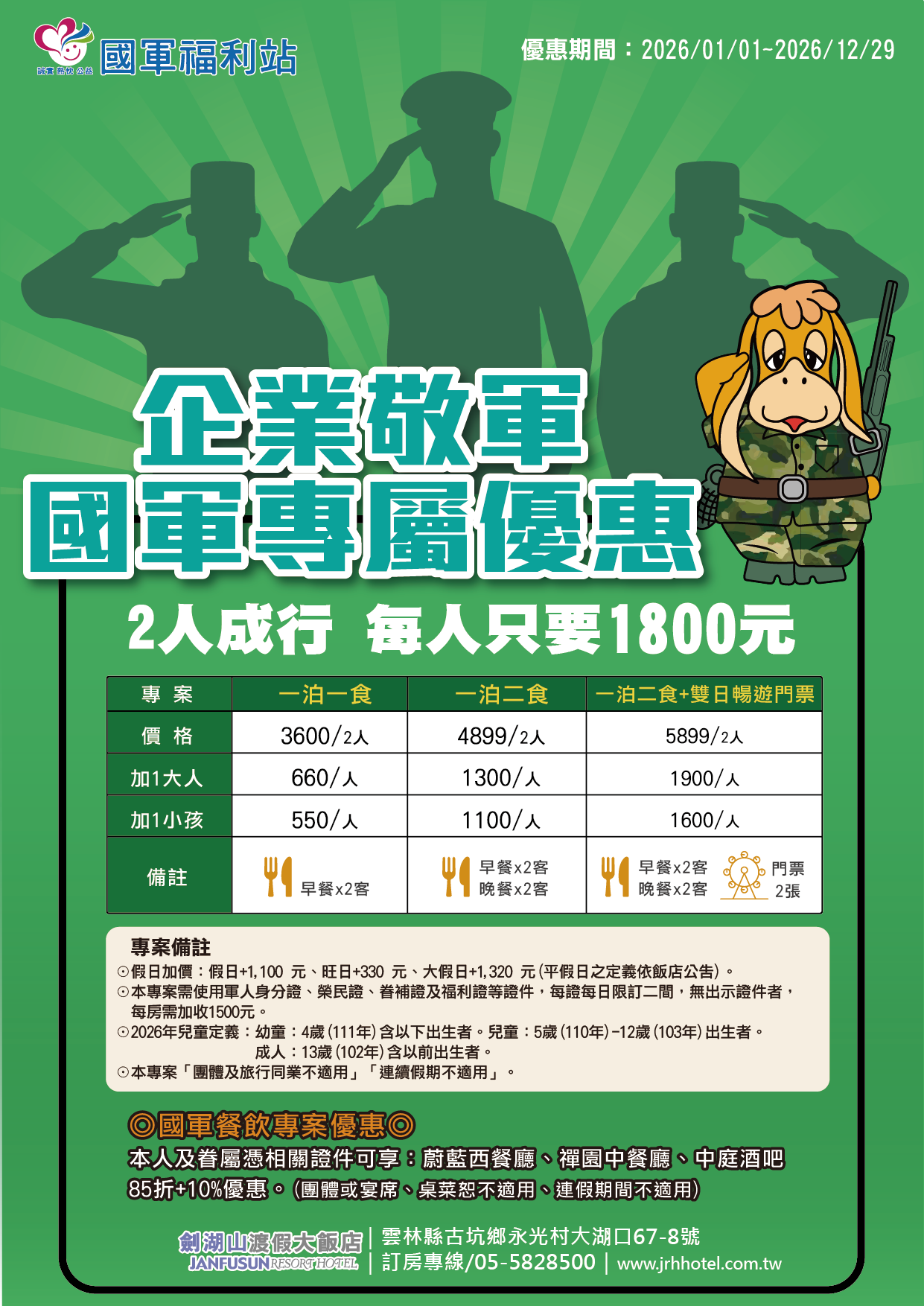 【2026】企業敬軍 ★ 國軍專屬住宿優惠 一泊一食最低每人$1800起