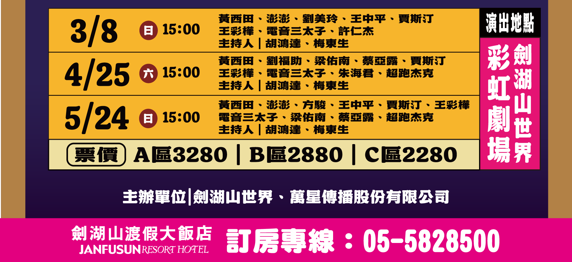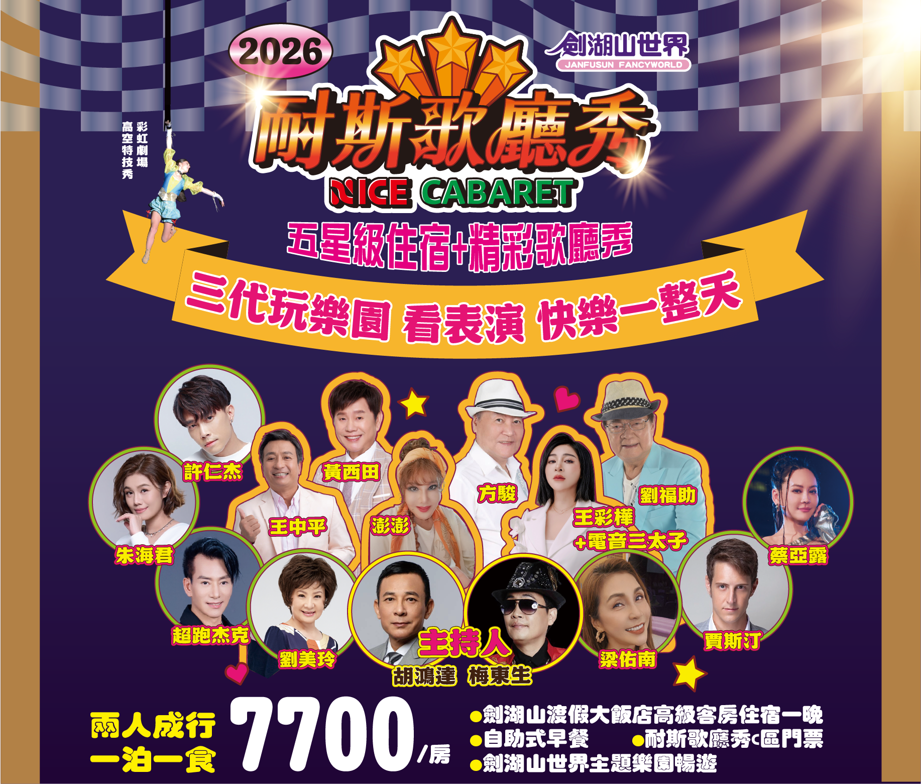 | 劍湖山的第一次 耐斯歌廳秀 隆重登場! 精彩卡司 笑彈連發、還有彩虹劇場高空特技秀 |