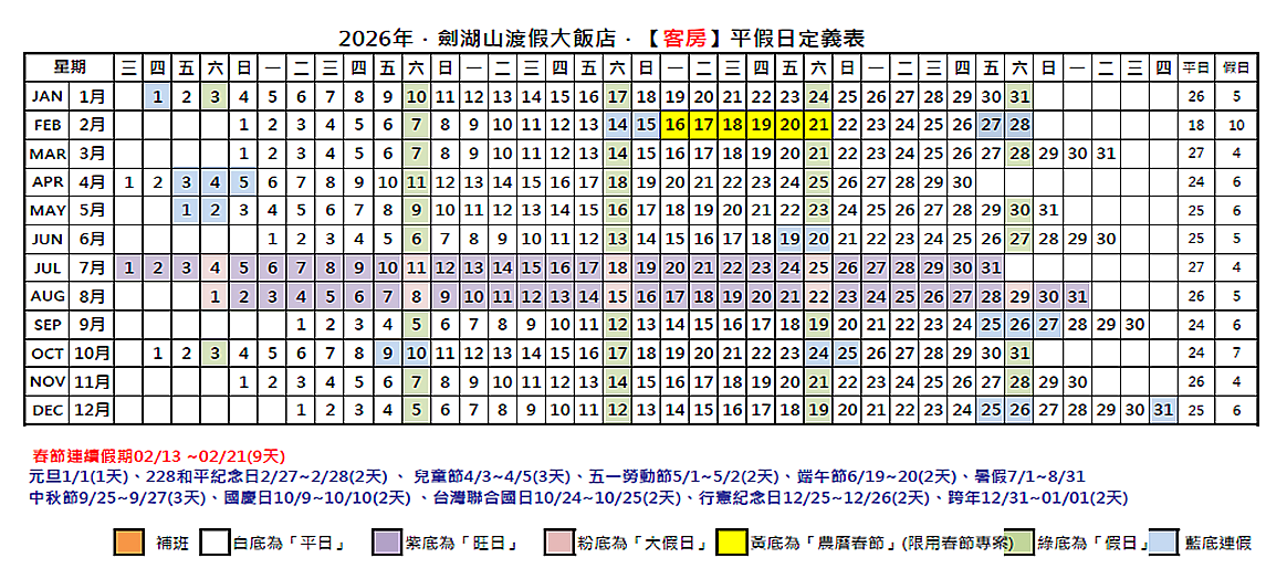 劍湖山渡假大飯店 2026年【客房】平假日定義表