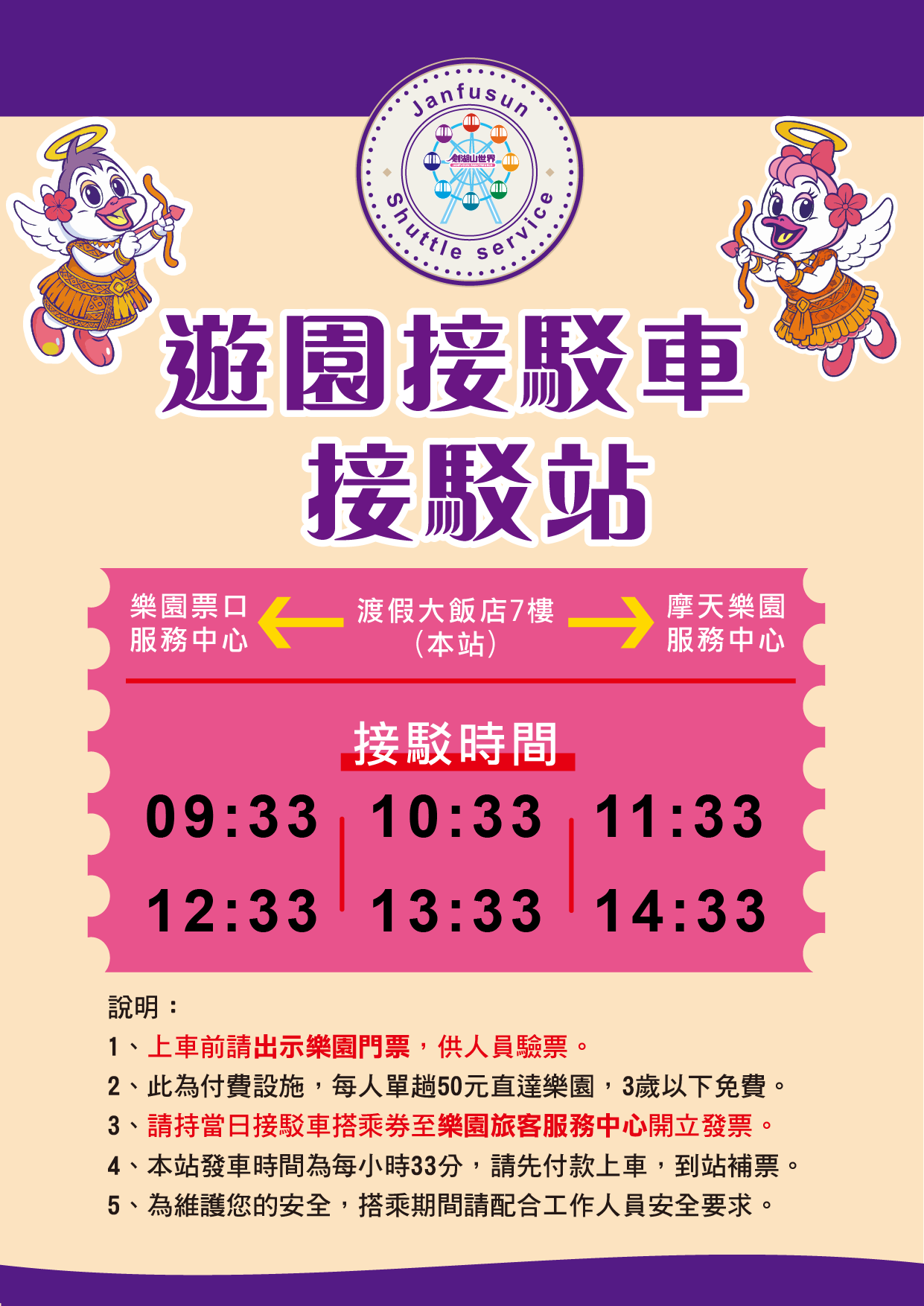 搭乘費用與購票方式 •持《住宿專案贈送》之接駁車票券,須先至摩天廣場服務中心預約車位。