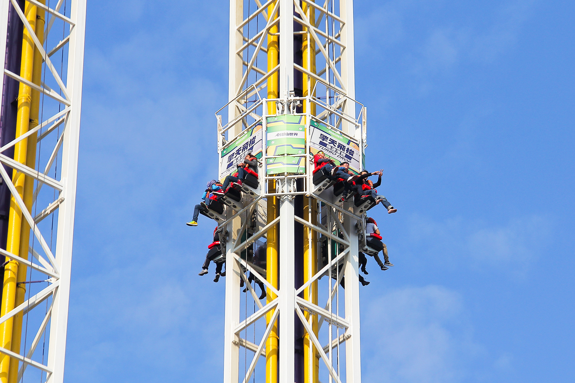 来自美国65米双座高塔,「一飞冲天」以80km的时速急升至65公尺的高空,挑战加倍大气压力,直冲天际! 「极速落体」从65公尺的高空以65km/hr的时速遽降,体验高空失重,强力坠落的感受!