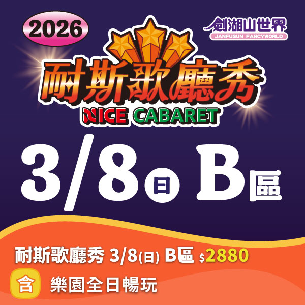 -票券內容:耐斯歌廳秀3月8日場次 B區門票 1張 ,劍湖山世界主題樂園 全票1張