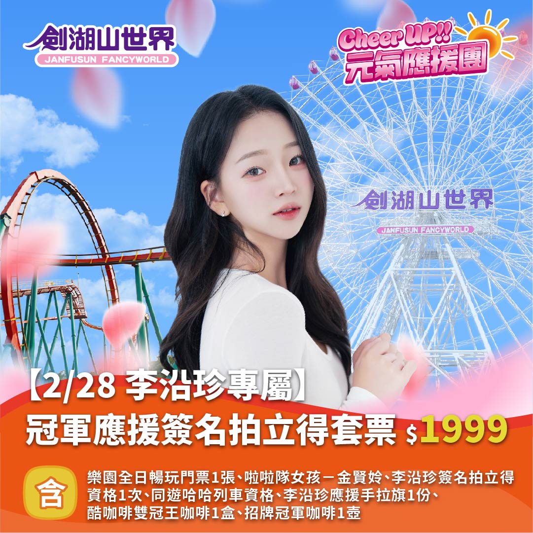-票券內容:劍湖山世界主題樂園 全票1張、啦啦隊女孩-李沿珍簽名拍立得資格1次、哈哈列車同遊資格、李沿珍應援手拉旗1份、酷咖啡雙冠王咖啡1盒、招牌冠軍咖啡1壺