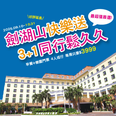 2025-09-15住宿優惠 【2025-2026】瘋跨年2026 #摩天輪煙火 2025-08-29住宿優惠 【2025】連假住宿優惠 |一泊一食最低每人只要$1800起 #2025連假 2025-08-28住宿優惠 【2025】粉絲日入住專案|兩人成行 只要$3099(含早餐) #指定日 放下工作,帶上快樂!指定日等你來Chill! 2025-09-08住宿優惠 【2025】劍湖山快樂送 3+1同行鬆久久 #3999 專案日期:2025/09/10-2025/12/30 2024-11-30住宿優惠 【2025年度住宿專案】一泊一食 X 兩人成行$4300元起 專案日期:2025年1月2日至12月30日 2024-12-18住宿優惠 【2025】高年級旅遊 兩人成行NT$2800/房起 #2025限定 專案日期:自2025年1月2日至2025年12月30日 2025-09-08住宿優惠 【2025】酷奇親子房 兩人成行一泊3食再招待1位12歲以下兒童 兩人成行一泊3食,每房再招待1位12歲以下兒童