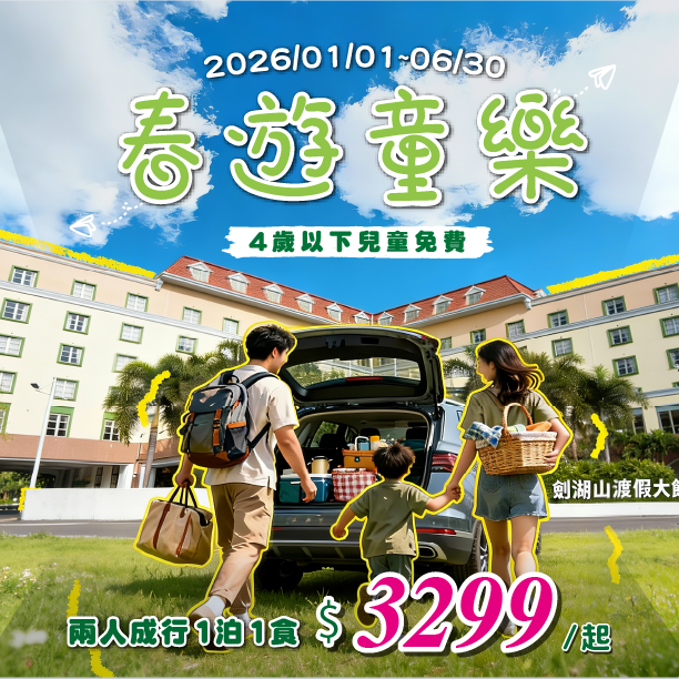 2025-10-25婚宴專案 【2026幸福花嫁情定劍湖山 婚宴專案】 讓劍湖山渡假大飯店,為您留下經典璀璨的幸福婚宴~ 2025-08-30住宿優惠 【2026】旺馬迎春 農曆春節住宿專案 2024-10-30餐飲優惠 春節餐飲營業時間 X 春節限定菜單 0000-00-00活動與公告 2/28前,入住「劍湖山渡假大飯店」 再享暢遊 「佐登妮絲城堡」!! 即日起至2月28日止 2026-01-11餐飲優惠 禪園中餐 X 海陸豐饌圍爐宴 2026-01-01活動與公告 劍湖山渡假大飯店 2026年【客房】平假日定義表 2026年劍湖山渡假大飯店客房平假日定義 2025-12-19住宿優惠 【2026】春遊童樂住宿專案 【2026】春遊童樂住宿專案 入住日期:2026/01/01(四)~2026/06/30(四) 2025-10-04餐飲優惠 尾牙春酒 x 優惠專案 2025-08-29住宿優惠 【2026】連假住宿優惠 |一泊一食 $4200|二泊二食$7000 2026連假住宿專案 2天1夜專案-適用日期:2026/2/14~15 3天2夜專案-適用日期:2/27~3/1、4/3~4/6、5/1~5/3、6/19~6/21、10/9~10/11、10/2 2026-01-16住宿優惠 【2026】2-3月『超寵粉UP』住宿專案~吃.住.玩.樂全包!! 2026寵粉無極限 吃.住.玩.樂全包!!! 加碼送~「佐登妮絲城堡」門票 2026-01-11餐飲優惠 年菜外帶 x 禪園中餐廳 2025-12-17住宿優惠 【2026】一月份指定日「超寵粉住宿專案」 超寵粉住宿專案 銷售日期:即日起~1/29止 2025-10-25婚宴專案 【2026年文定專案】珍愛一生 情定劍湖山 締結良緣幸福從這裡開始吧! 2025-04-01餐飲優惠 蔚藍西餐廳x暖冬藥膳美食季 2025-01-01活動與公告 劍湖山渡假大飯店 2026年【餐飲】平假日定義表 2026年劍湖山渡假大飯店餐飲平假日定義 2025-12-13住宿優惠 【2026當月壽星】住宿專案 生日是一年一度的特別日子,來場獨特的住宿體驗! 專案日期:2026年1月2日至12月29日 2025-06-12住宿優惠 【2025】普發一萬 劍湖山送一萬✦* 【2025】普發一萬劍湖山送一萬✦* 專案日期:即日起至~2026/06/30止 2024-05-23活動與公告 接駁車時刻表 斗六火車站及雲林高鐵站接駁時刻表 2023-12-30餐飲優惠 #2026限定 蔚藍西餐廳x鄉親優惠 2024-11-22活動與公告 隱私權暨個資保護聲明 2026-01-01餐飲優惠 #2026限定 壽星用餐優惠 2025-10-08活動與公告 安心宣言 安心美味,從嚴格把關開始 2026-01-01住宿優惠 【2026】旅行趣~ #年度住宿專案 2025-12-10住宿優惠 【2026】高年級旅遊 兩人成行NT$2888/房起 #2026限定 專案日期:自2026年1月2日至2026年12月29日 2024-04-04活動與公告 住宿不提供一次性備品 公告 因應政府環保政策, 飯店自2024年7月1日起,將不提供一次性客房備品。 2023-12-30餐飲優惠 #2026限定 蔚藍西餐廳x銀髮優惠 2026-01-16住宿優惠 【2026】酷奇親子房 兩人成行一泊3食再招待1位12歲以下兒童 兩人成行一泊3食,每房再招待1位12歲以下兒童 2026-01-16住宿優惠 【2026】企業敬軍 ★ 國軍專屬住宿優惠 一泊一食最低每人$1800起 國軍專屬住宿優惠 2025-10-15婚宴專案 【2026年戶外證婚儀式專案】 2025-09-01餐飲優惠 西餐酥皮濃湯加購享優惠 2024-10-01餐飲優惠 限定伴手禮幸福手作餅乾X中庭酒吧 劍湖山渡假大飯店限定幸福手作餅乾,讚不絕口的好滋味! 2023-11-21餐飲優惠 精選伴手禮 劍湖山渡假大飯店限定好禮!!! 2023-01-08餐飲優惠 劍湖山渡假大飯店x經典『啡黃酥』禮盒 『啡黃酥』榮獲雲林良品伴手禮金讚獎!