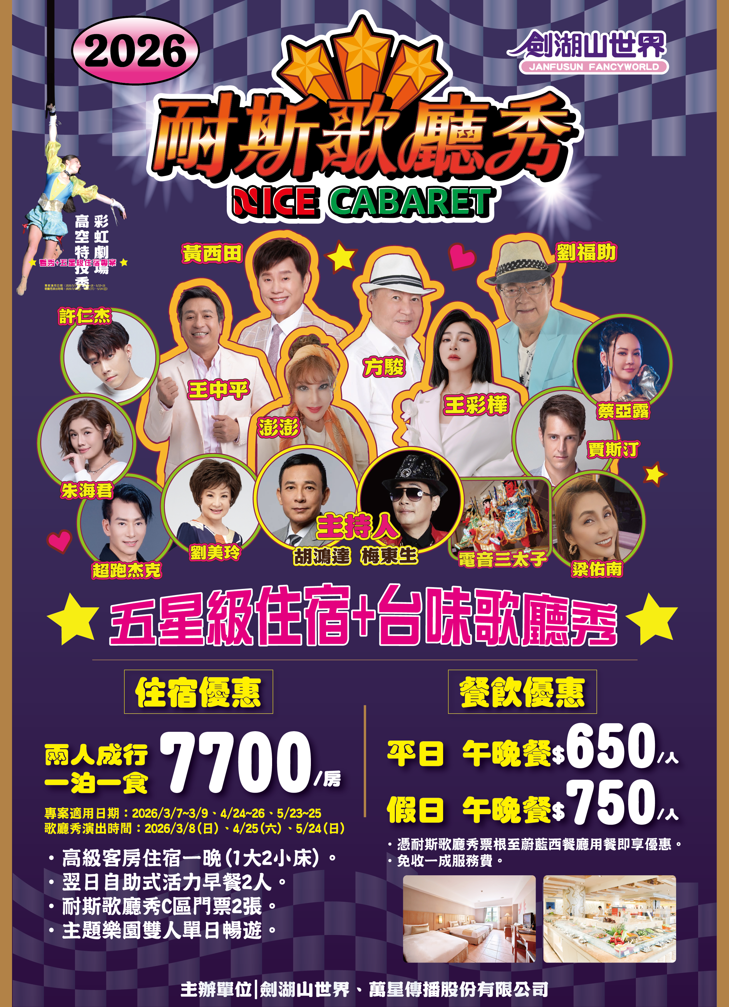 | 專案適用日期:2026/3/7~3/9、4/24~26、5/23~25 歌廳秀演出時間:2026/3/8(日)、4/25(六)、5/24(日) |